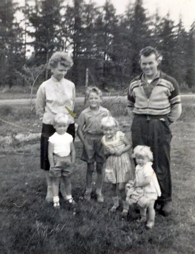 Alle Jyttes børn. Fra venstre: Pauline, Troels, Annette, Torben, Jane og Jørgen.