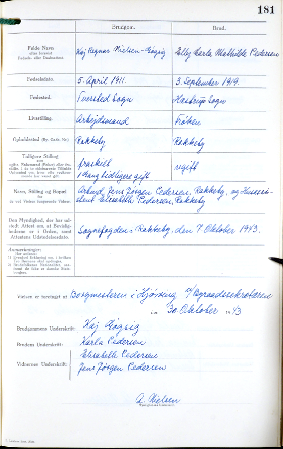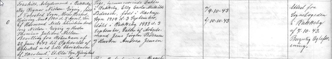 De blev borgerligt viet den 7 oktober 1943. Kilde: Hjørring kommune Giftefogeden Ægteskabsjournal.