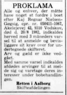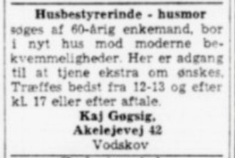 1½ år efter Carlas død har Kaj følgende annonce i Aalborg stiftstidende: Husbestyrerinde – husmor søges af 60-årig enkemand, bor i nyt hus med moderne bekvemmeligheder. Her er adgang til at tjene lidt ekstra om ønskes. Træffes bedst fra 12-13 og efter 17 eller efter aftale. Om Kaj fik en husbestyrerinde vides ikke.
