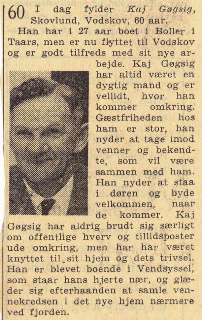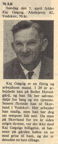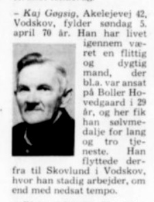 Kaj fik arbejde i ”Skovlund” i Vodskov. Han har altid været meget arbejdsom, men har dog sat tempoet lidt ned. Da man på ”Skovlund” solgte dyrene, var det ikke med Kaj Gøgsigs billigelse, så bønderne på gården købte en so med grise til ham som han kunne gå og passe, og desuden var der også en hest tilbage.