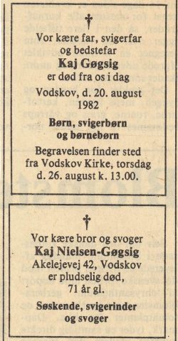 Kaj Nielsen-Gøgsig døde den 20. august i Vodskov, Kær, Aalborg, i en alder af 71 år.