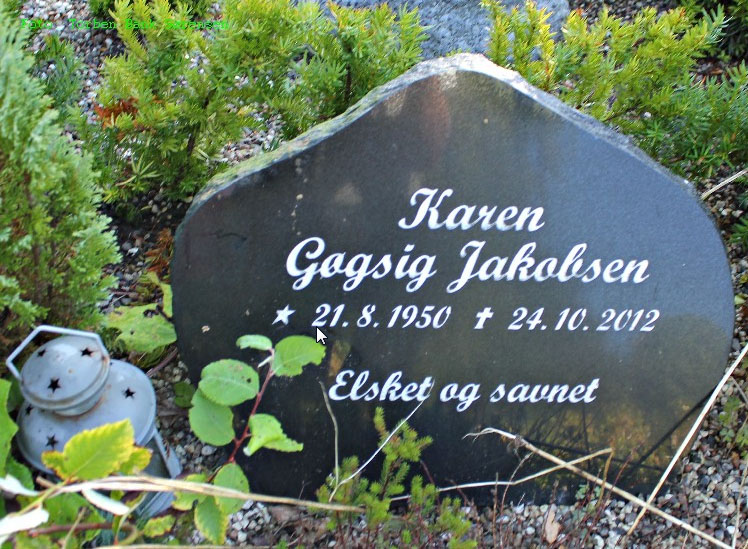 (I10). Karen Gøgsig Jakobsen (f. 21. august 1950 – d. 24. oktober 2012) blev i 1975 gift med Fin Hansen  (f. 1949 – d. 20xx). Blev skilt og gift med Bent Madsen