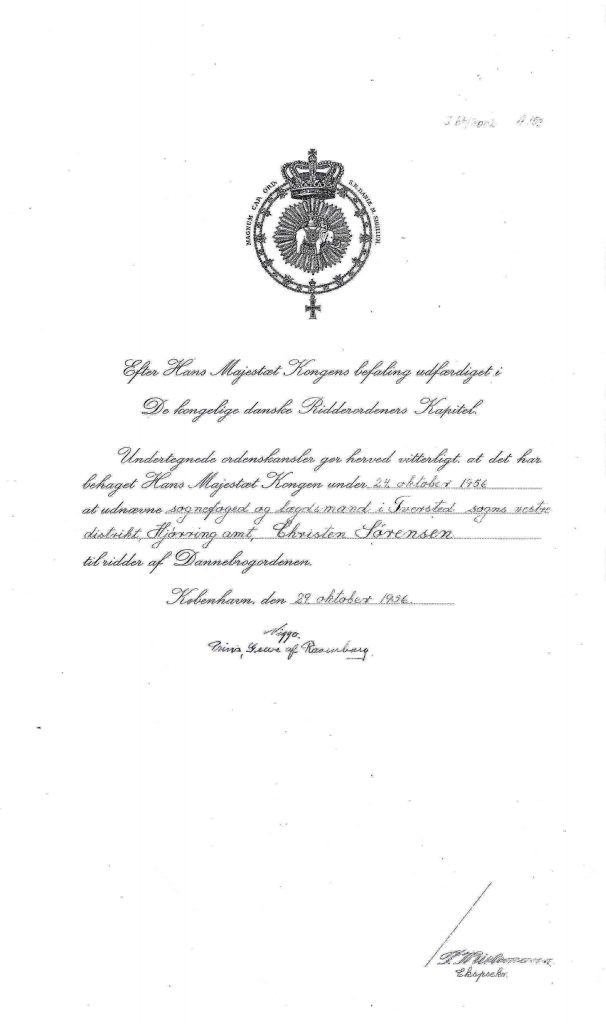 Den 29 oktober 1956 blev Sognefogeden Chr. Sørensen Udnævnt til ridder af Dannebro.