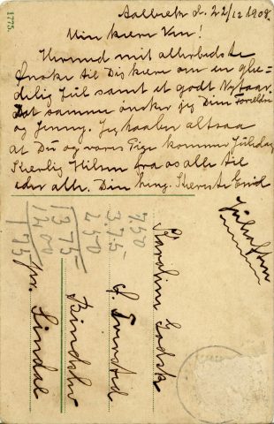 Den 22. december 1908 sender Emil Andersen i Aalbæk et Julekort til Karoline Godsk. Emil ønsker glædelig Jul og håber at Karoline og ”Vores lille Pige” kommer på besøg Juledag. Jenny er nu blevet 4 år.