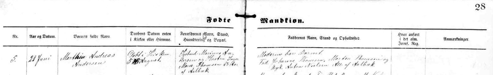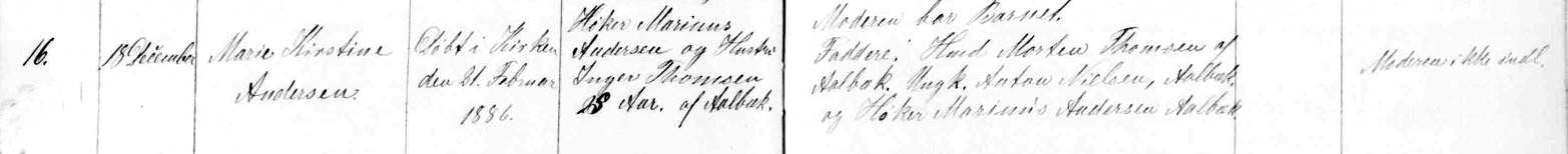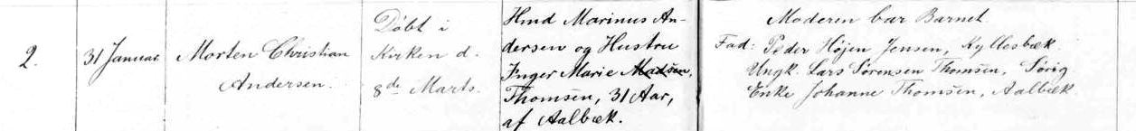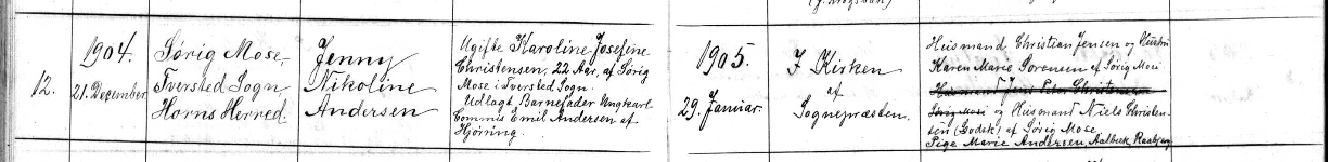 I Sørig kirkes kirkebog er noteret følgende: Jenny Nikoline Andersen født i Tuen af ugift Karoline Josefine Christensen 22 år, af Sørig mose i Tværsted sogn. Udlagt barnefader ungkarl Commis Emil Andersen af Hjørring.