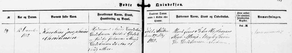 Karoline Josefine Christensen der er datter af Johanne Marie Christensen (kaldet Hanne) og Husmand Niels Christian Christensen (Godsk) blev født i Tuen d. 13. december 1882.