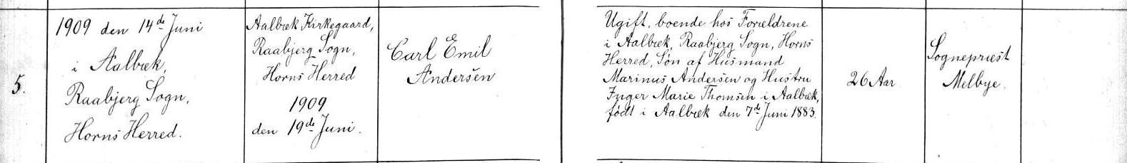 Carl Emil Andersen døde den 14. juni 1909 i Aalbæk, Raabjerg sogn, Horns Herred. Han blev kun 26 år gammel.