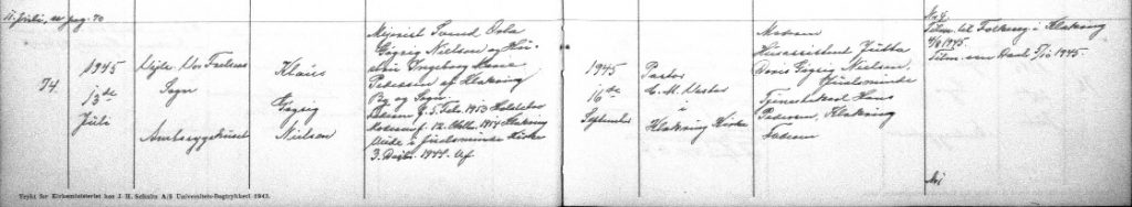 Klaus er født på Vejle sygehus den 13 juli 1945. Vor frelser sogn i Vejle.