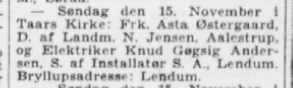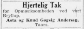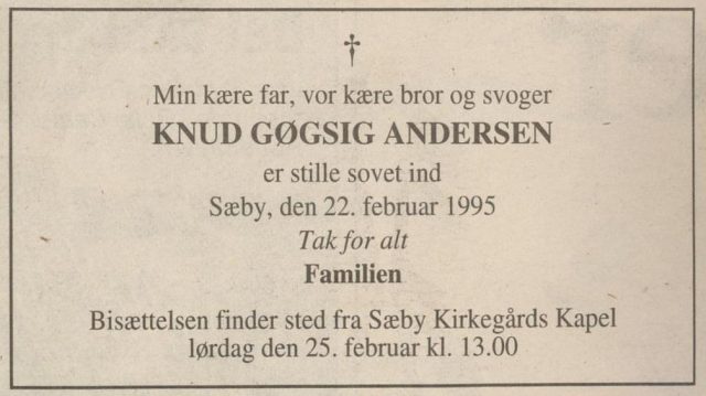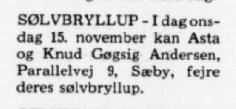 (A11). Knud Gøgsig Andersen (f. 22. oktober 1926 – d. 22. februar 1995) blev d. 15 november 1953 gift med Asta Østergaard (f. 5. marts 1927 – d. 19xx).