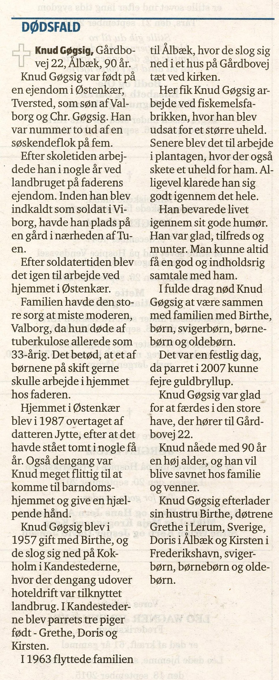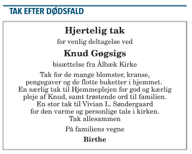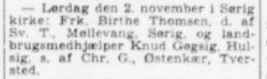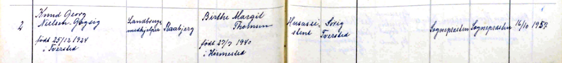 (L02). Knud Georg Nielsen-Gøgsig (f. 25. december 1924 – d. 11. september 2015) blev d 2. november 1957 gift i Sørig kirke med Birthe Margit Thomsen, (f. 27. juli 1940 i Hørmested)