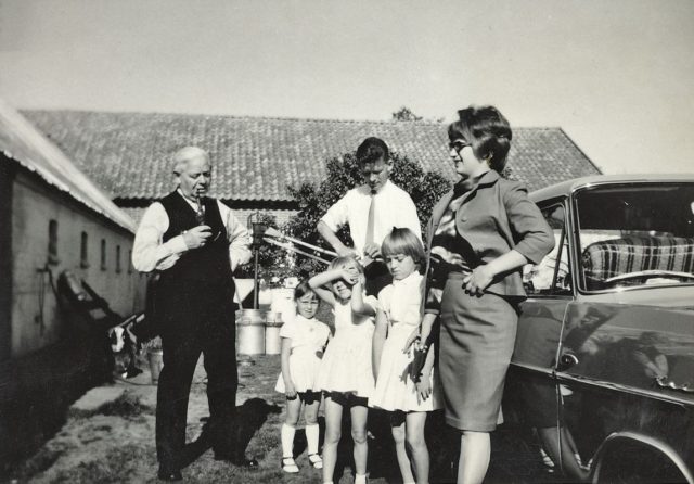 Knud og Birthe på besøg hos Christian Nielsen-Gøgsig på Østenkær, sammen med deres 3 børn Kirsten, Doris og Grethe.