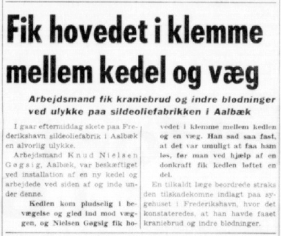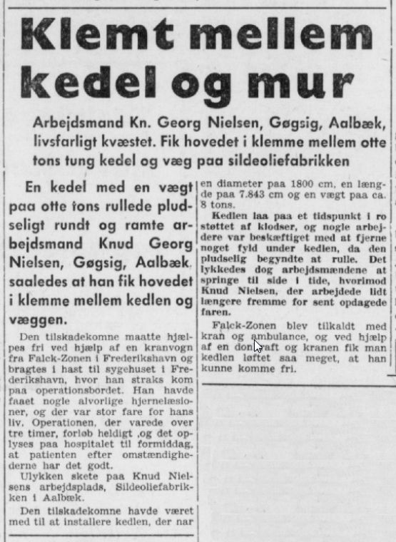 Knud fik arbejde på sildeoliefabrikken i Aalbæk. Her var han udsat for en alvorlig arbejdsulykke, hvor han fik hovedet i klemme mellem en væg og en kedel på ca. 8 tons. Knud kom først fri da Falck-Zonen fik flyttet kedlen tilstrækkeligt ved hjælp af en donkraft. Knud havde fået kraniebrud og kom på operationsbordet i Frederikshavn. Operationen forløb heldigt og Knud havde det efter omstændighederne godt.