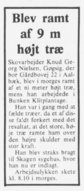 13 år efter ulykken på sildeoliefabrikken kom Knud igen ud for en ulykke. Om morgenen den 21. oktober 1977 blev Knud ramt af et ni meter højt grantræ, der væltede ned over ham, medens han arbejdede i Bunken Klitplantage. Træet ramte ham med stor kraft over den højre skulder. Han blev straks bragt til Skagen Sygehus hvor han blev indlagt. Efter denne ulykke fik Knud en ny hofte, som gav mange besværligheder.