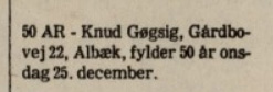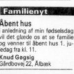 Det underlige er bare da Knuds yngre bror Pouls ældste datter Mona 3 år tidligere i 1954 skulle døbes i Ålbæk Kirke. Da var der ingen problemer. Af Kirkebogen fremgår det at Mona blev døbt Mona Gøgsig. Alle Poul og Bodils 3 børn (Mona, Lena og Irna) fik efternavnet Gøgsig og ikke Nielsen-Gøgsig