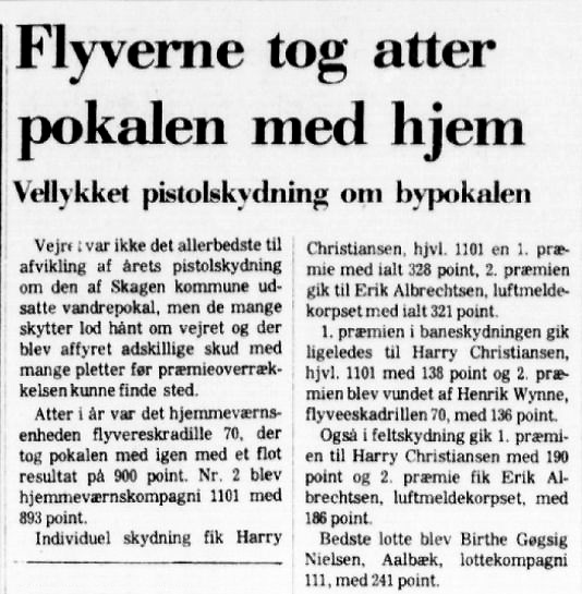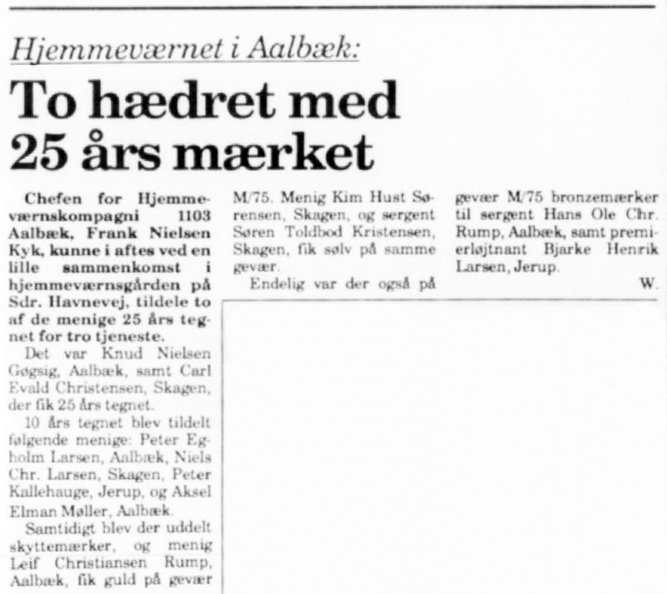 bedste Lotte blev Birthe Nielsen Gøgsig, Aalbæk, lottekompagni 111 med 241 point. Ved en lille sammenkomst i Aalbæk hjemmeværnsgården, blev Knud hædret i 1989 med 25 års mærket for tro tjeneste.