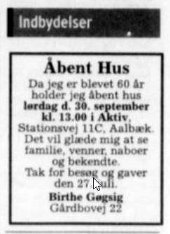Da Birthe i 2000 blev 60 år holdt hun åbent hus i Aktiv på Stationsvej 11C, for familien, venner, naboer og bekendte.