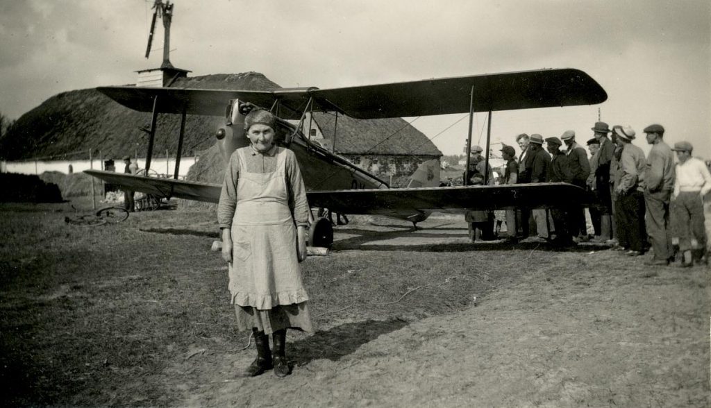 Flyveren blev nøje studeret. Foran, Mine, der var husbestyrerinde hos Marius Godsk (senior). Bag flyveren, Richard Danielsens ejendom, på hvis mark flyet landede. (Skagensvej 122).