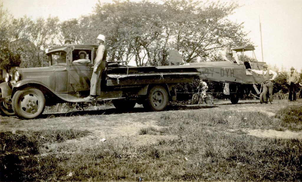Lastbil med flyver 1935. Vognmand Søren Sørensen, Chr Møller på trinbrættet, Piloten, Danielsen og Nielsen-Gøgsig.