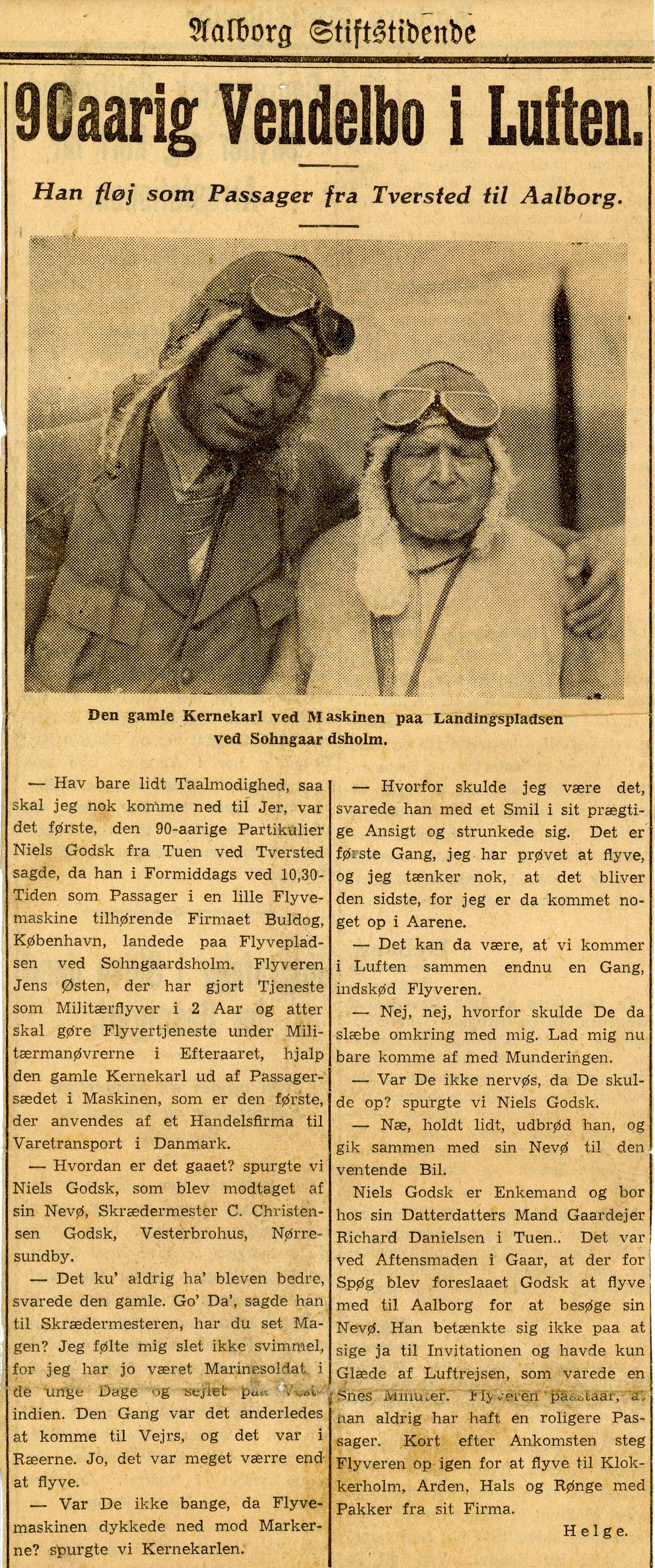 Piloten Jens Østen, Niels Godsk og Gårdejer Richard Danielsen, står ved flyveren. Den 90 årige Niels Godsk er her klar til at flyve med til Aalborg.