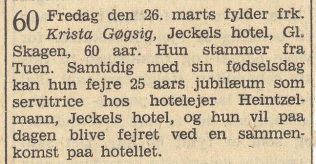 • Bente Nielsen Gøgsig (f. 1941): fik arbejde på Jeckels Hotel i Gl. Skagen hos Christa Nielsen-Gøgsig. Mange af Bentes kusiner har også haft sommerjob på Jeckels. De fik typisk job som: smørebrødsjomfru, vaskekone, barnepige, eller stuepige.