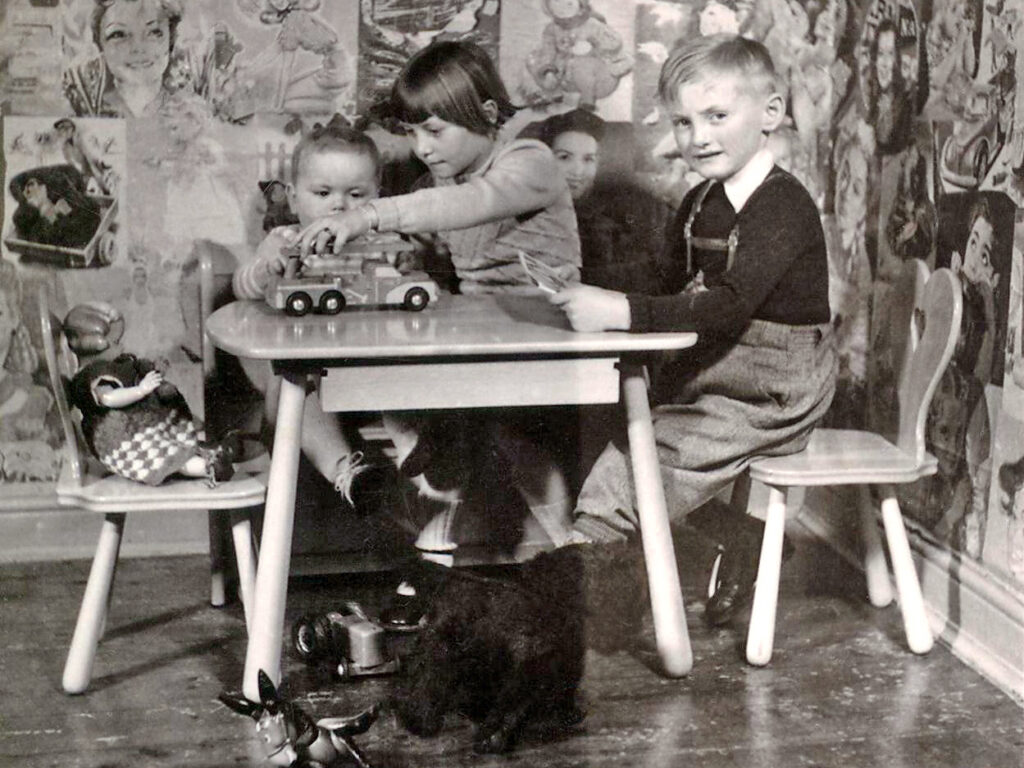 Hans, Dorte og Mads i legestuen, hvor der er brugt forsider af ugeblade som tapet på vægen.