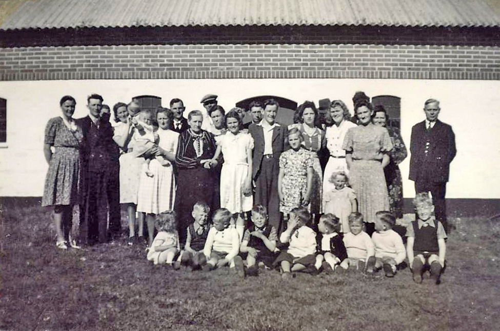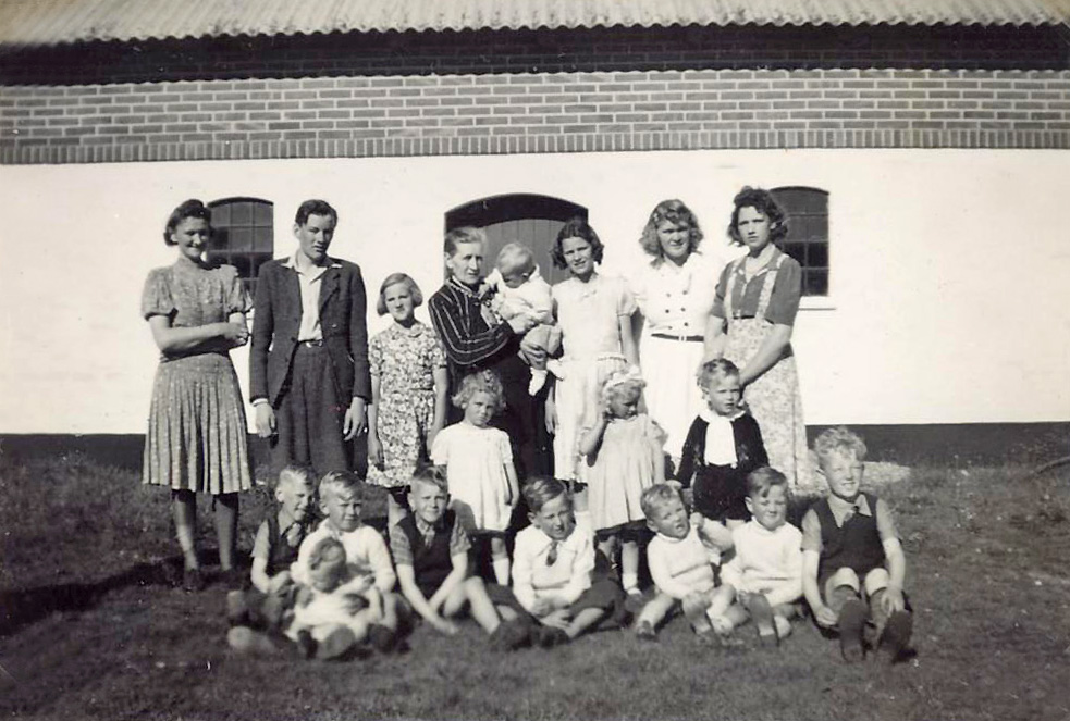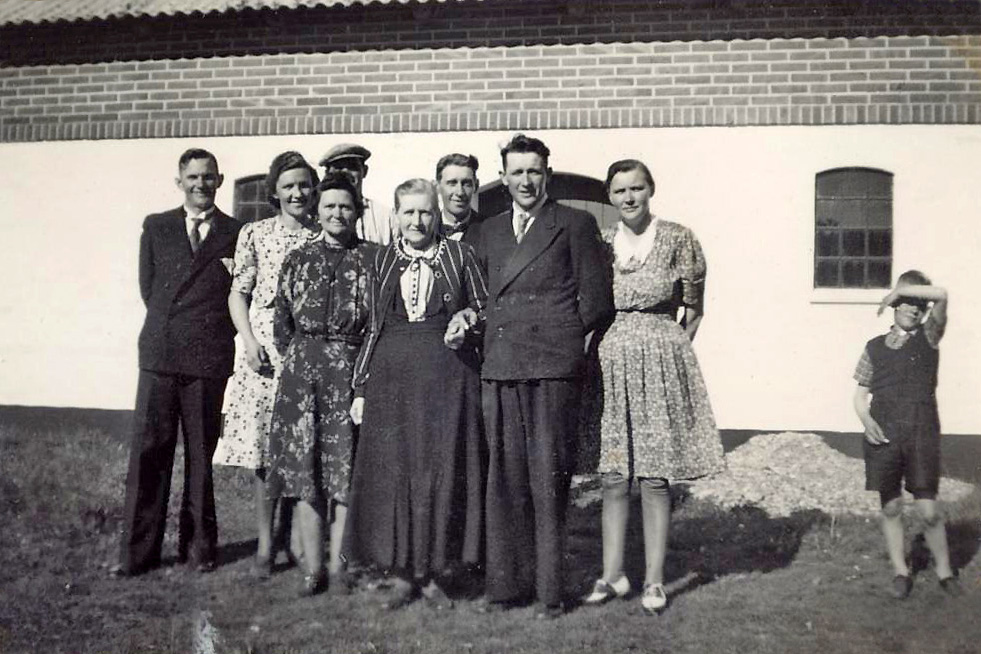Fra venstre Kaj – Ane – Ingeborg – Hermann med kasket – Thomine – Hans – Tage – Christa og Aage helt til højre