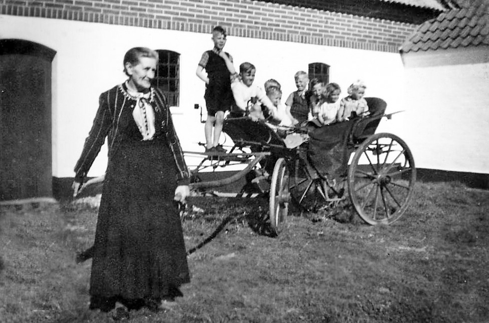 Thomine Juliane og børnebørn på jumben i Lille Gøgsig, Tuen. (Bente Nielsen-Gøgsig(1941) husker i øvrigt, at hun har fået tur i jumben som lille).