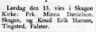 (G06). Minna Danielsen (f. 18. juli 1932 i Tversted – d. 10. maj 1996). blev d. 13. oktober 1951 gift med skovløber Knud Erik Hansen (f. 10. april 1931 – d. 28. december 2020).