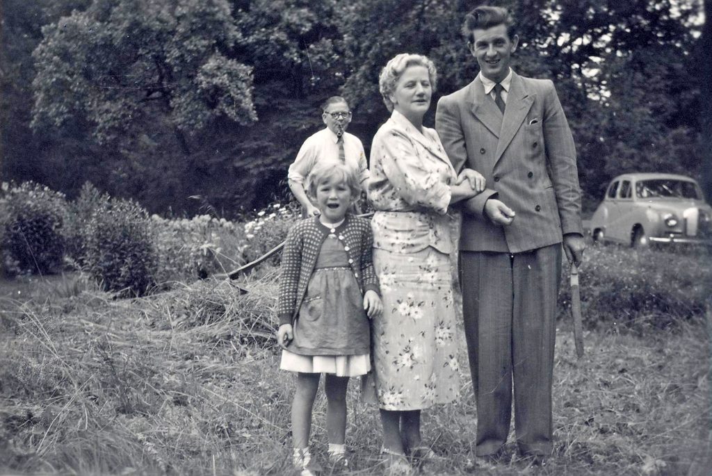 1957 Annette, Otto, Jenny Danielsen og Knud Hansen. Bilen er en flødefarvet Austin A 40 Somerset årgang 1954