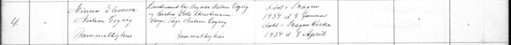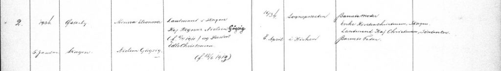Minna Elenora Nielsen Gøgsig er født året efter i Østerby i Skagen den 5. januar 1934. Ved barnedåb var forældrene, Edles bror Landmand Kaj Christensen fra Sønderskov og Enke Kirsten Christensen Skagen noteret som faddere.