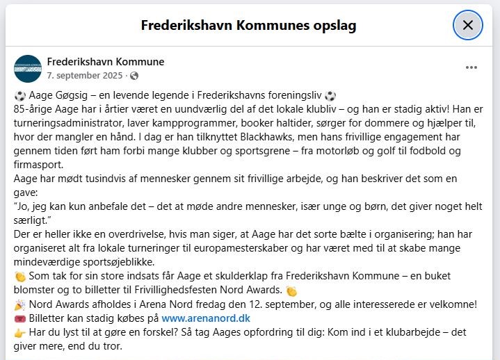 I Frederikshavn blev der den 14. juni 2022 uddelt priser til den helt store guldmedalje, da frivillige ildsjæle, idrætstalenter, og kulturkapaciteter var inviteret til Prisfest. I den anledning fik Aage Gøgsig prisen for ”Årets bedste lederpræstation”.