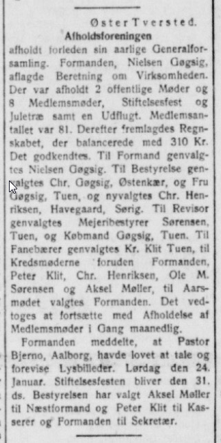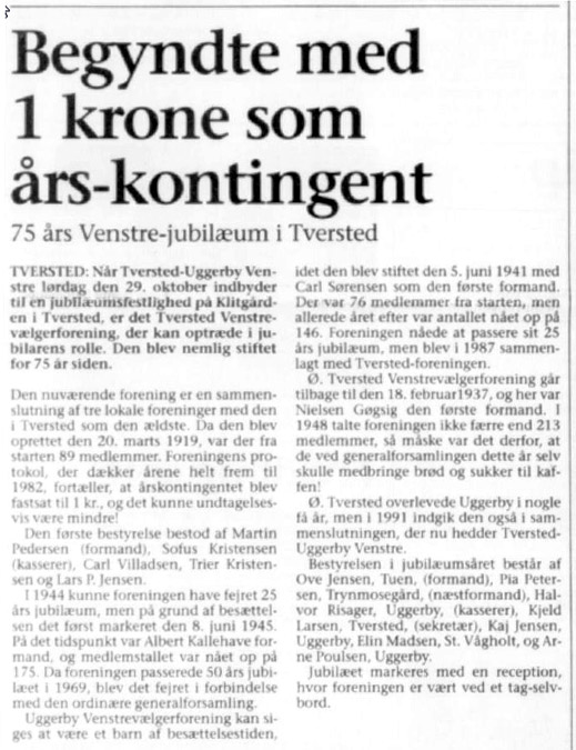 Vendsyssel Tidende 1994-10-23. Ø. Tversted Venstrevælgerforening går tilbage til den 18. februar 1937, og her var Nielsen Gøgsig den første formand.