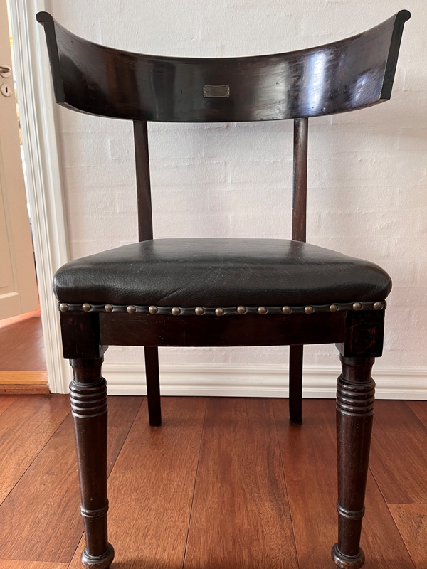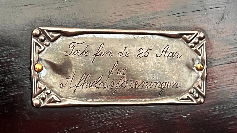 Stolen er en gave til Niels Christian Gøgsig for 25 års arbejde i afholdsforeningen. Stolens træværk og sølvplade er intakt, men den har som den eneste ændring fået et nyt sæde. Stolen står i dag hos Mette Gøgsig Steen og er således stadig i familiens eje.