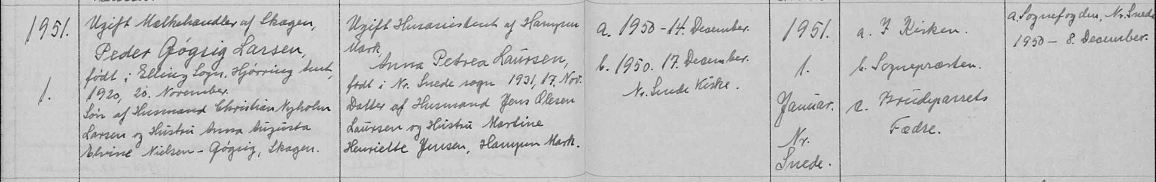 Indtil nu havde Peter boet hjemme i ”Fredensklit”, men efter brylluppet fik Anna og Peter en lille lejlighed nede ved skjoldborg i Gl. Skagen. Der var en lille stue, et lille soveværelse og et lille køkken. Der var fælles lokum i gården. Medens de boede der blev deres første søn Hans Jørgen Gøgsig Larsen født.
