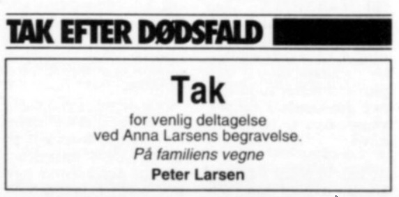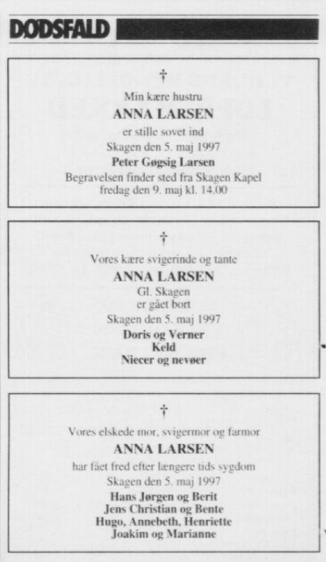 To år efter dør Anna Larsen (den 5. maj 1997). Hun bliver begravet på Højen kirkegård.
