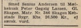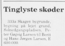 Nordjydske Stiftstidende 2000-10-22. Peter Gøgsig Larsen sælger byggegrund i Gl Skagen til sønnerne Jens Christian og Hans Jørgen.