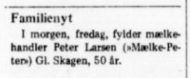 Det var startskuddet til Peters 35 års mælkeforretning. Det startede med et mælkeudsalg nede på Skagen havn, og udviklede sig til mælkesalg fra flere mælkebiler både på havnen og i hele Skagen, inden Peter som den sidste måtte lukke mælkeforretningen i 1971.