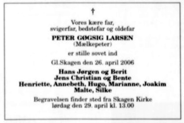 Peter fik 5 børnebørn og et oldebarn. Peter Gøgsig Larsen døde d. 26. april 2006. Han ligger begravet på Højen kirkegård i Gl Skagen.