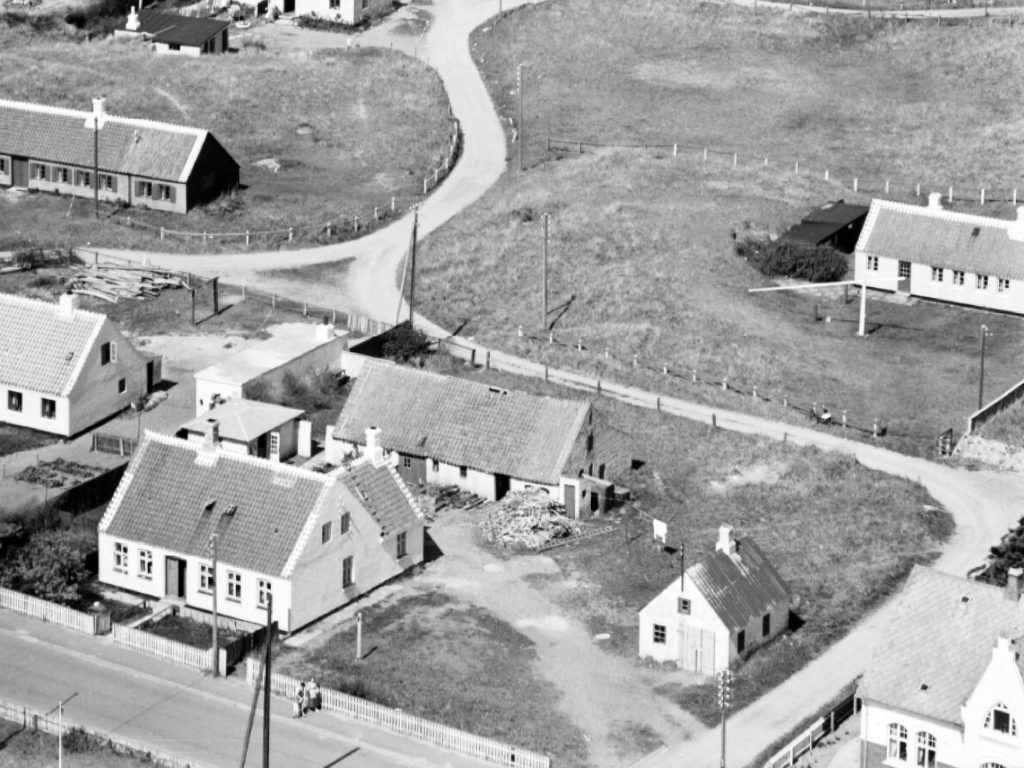 Luftfoto af forhus, baghus og selve smedjen fra 1959.