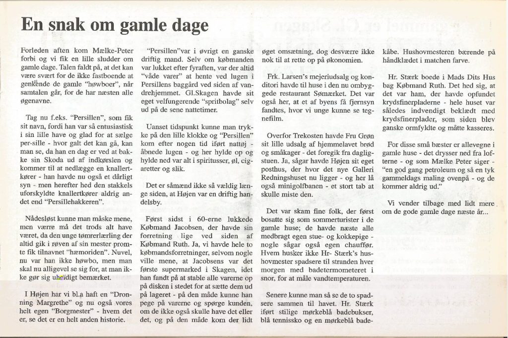 Peter var altid klar til en snak om gamle dage i Højen. Teksten stammer fra i en lille avis, som hedder ”Lidt om Gl. Skagen”, udgivet af Gl. Skagens erhvervsdrivende, maj måned 2001.