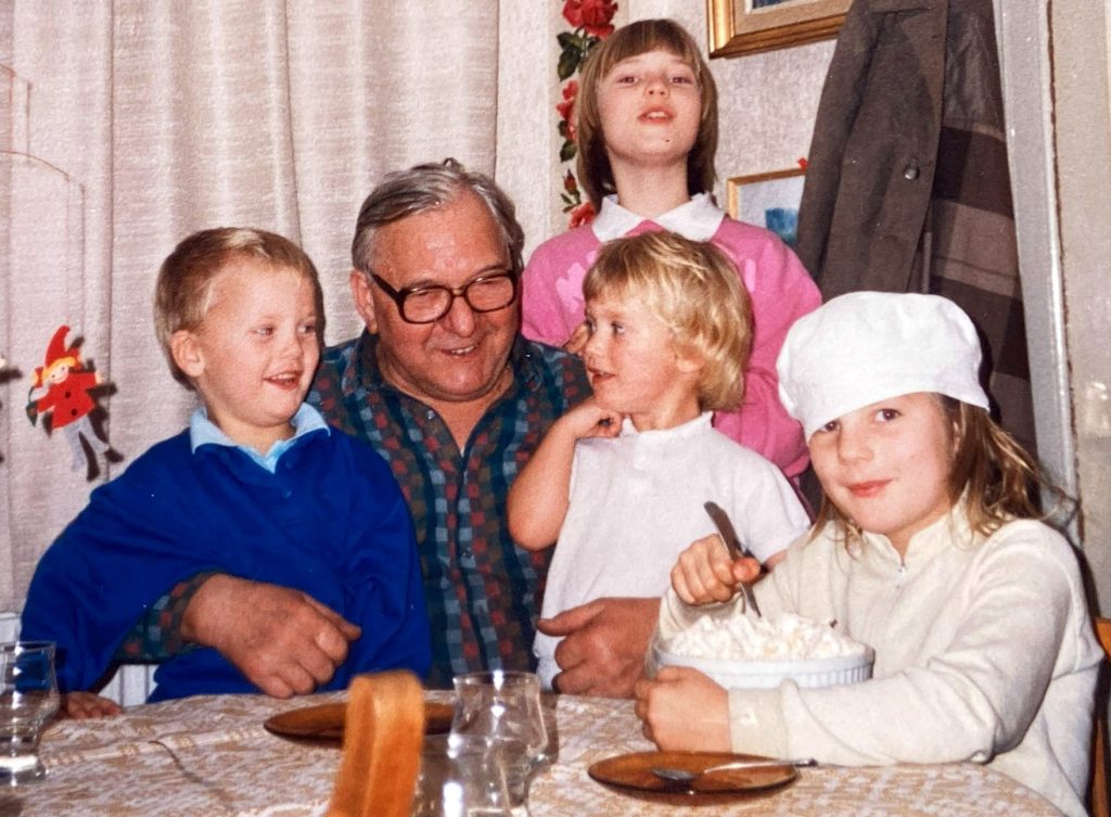 Peter Larsen med børnebørnene: fra venstre Hugo, Henriette, Marianne og Annebeth.