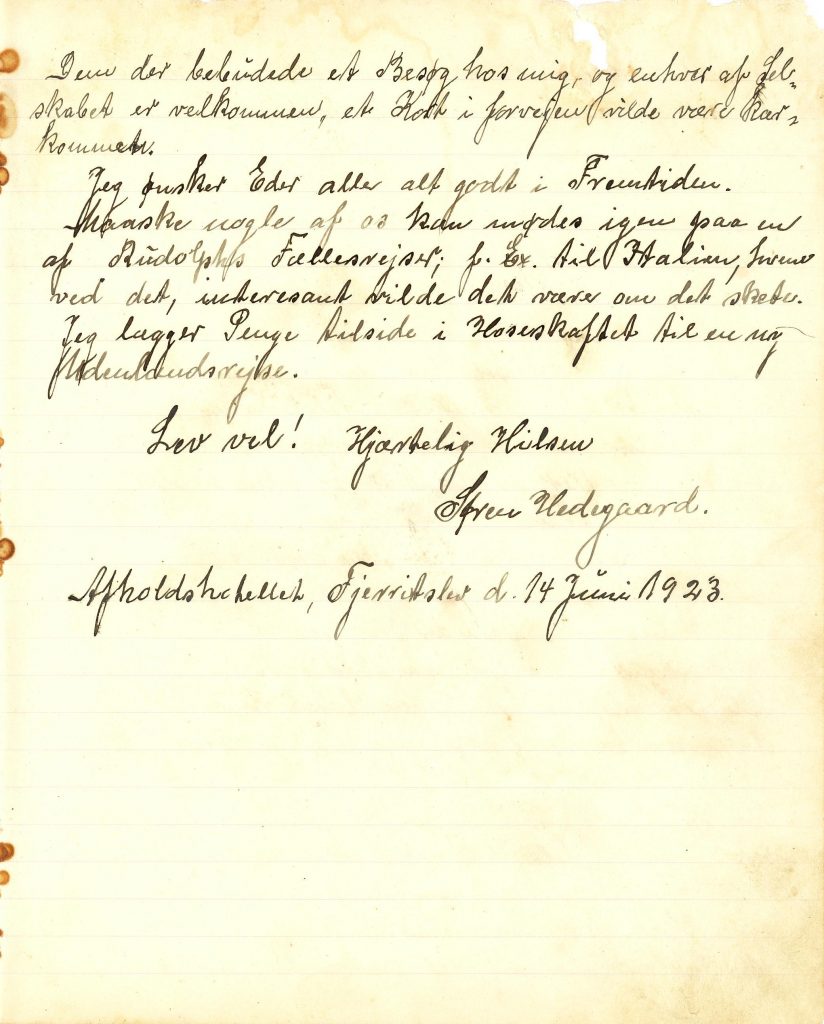 Efter rejsen blev der lavet en rejsebog. Den blev sendt rundt til alle deltagere, så de efter tur kunne skrive deres oplevelse af rejsen ind i bogen. Desværre så mangler omslaget og den første side i rejsebogen. Denne side indeholdt navnene de første 20 rejsedeltagere. Uvist af hvilken grund nåede rejsebogen ikke rundt til alle deltagere, men personerne fra 1 til 16 i deltagerlisten nåede at skrive i bogen. Bogen strandede ved nr. 17 Jørgen Nielsen-Gøgsig i Jerup, der aldrig fik skrevet i bogen. Bogen blev fundet i boet efter ham. Personnavnene fra 18 til 20 i deltagerlisten kan ikke udledes af rejsedagbogen men er fundet i Knud Holsts gengivelse af deltagerlisten. Disse personer er også omtalt ved fornavne i rejsebogen. Af de eksisterende sider af rejsebogens fremgår det, at personerne fra 21 til 27 også har deltaget i rejsen, men bogen nåede som sagt aldrig frem til dem.