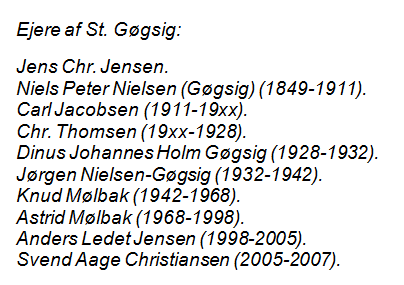 Knud døde i 1968, mens Astrid fortsat stod som ejer i 1997. De godt 120 tønder land, der fordeler sig med omtrent halvdelen på hver side af Skagensvejen, lod hun først drive med fodermester, men de seneste 5-6 år er jorden blevet forpagtet ud. Som et supplement til indtægten fra jorden har Astrid fra midten af 1980’erne også givet de mange feriegæster i sommerlandet mulighed for at nyde godt af den gøgsigske idyl med værelsesudlejning og har i den forbindelse ladet opføre et stort, flot hus på marken i retning mod Lille Gøgsig.