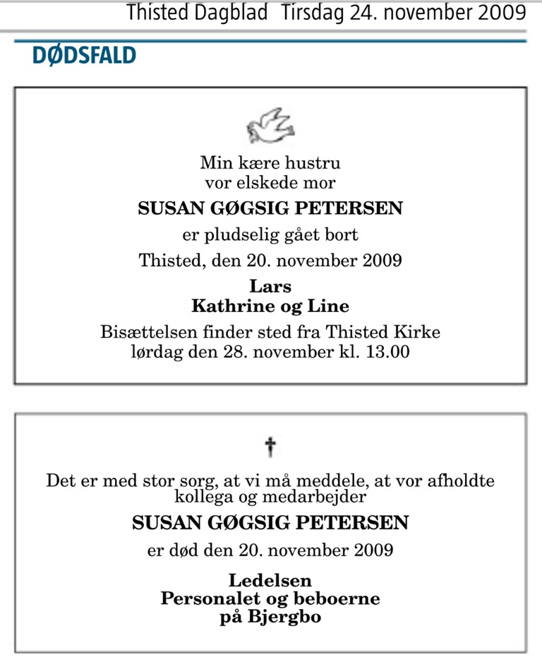 (I09). Susan Gøgsig Nielsen (f. 25. februar 1961 – d. 20. november 2009) blev i 19xx gift med Lars Petersen (f. 19xx – d. 20xx).