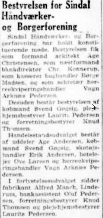 Bestyrelsen og forlystelsesudvalget for Sindal Håndværker- og Borgerforening. Fotograferet ved foreningens 50 års jubilæum december 1949. – Bagerst fra venstre: Dyrlæge Clausen, Niels Jakobsen, Tage Hust, Th. Sørensen, Svend Gøgsig. Første række, fra venstre: Læge Nordentoft, Emil Justesen, Dir. A. Pedersen og Mikkelsen.