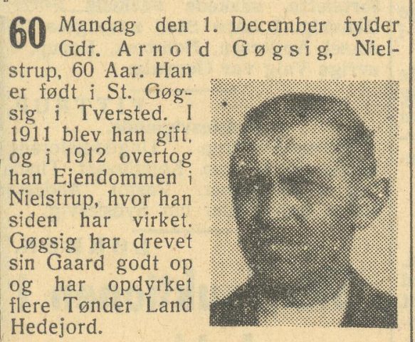 Arnold og hans familie hørte altså til husmandsstanden, akkurat som storebroderen Niels Christian på Lille Gøgsig, og Arnold deltog da også i nogle af Husmandsbevægelsens miljøer; f.eks. var han en overgang bestyrelsesformand i Nielstrup Andelsmejeri. Med hårdt arbejde og et mådeholdende forbrug lykkedes det familien at få noget ud af det magre landsted ved Ålbækbugten. En del af den golde hede- og engjord blev gennem årene omdannet til agerjord, og såvel børnene som fru Marie deltog særdeles aktivt i både markarbejdet og det indendørs.[1] Den medhjælpende familie måtte dog passe på at gøre tingene rigtigt, da Arnold var en mand, der holdt meget af orden. Og til uorden talte i hans øjne tabte halmstrå eller en mistet knappenål; så var det ned på alle fire og lede til han havde fundet nålen igen, thi fundet, dét blev den. En del af baggrunden for denne udholdende påpasselighed med inventaret kan rimeligvis også findes i den gennemgående gøgsig’ske sparsommelighed og sunde afstandtagen til unødvendige omkostninger i dagligdagen, der efter sigende skulle være en vægtig bestanddel af Gøgsigslægtens karakteristika.