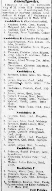 Afsnit tilføjet af Mads Gøgsig: Ved kommunal valget den 3. marts 1933 var gårdmand Arnold Gøgsig Nielstrup opstillet på kandidat liste C (Vendsyssel Tidende 1933-03-03)